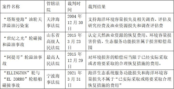 我国船舶油污损害赔偿案件基数较少,但从有限的司法判例来看,海洋生态索赔项目中,海洋生态系统服务功能损失和海洋环境容量损失虽曾获得过法院支持和认定,但对船舶油污导致的海洋生态损害的认定范围可能将出现“限于已实际采取或者将要采取的合理恢复措施的费用”的趋势。